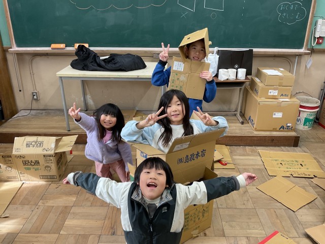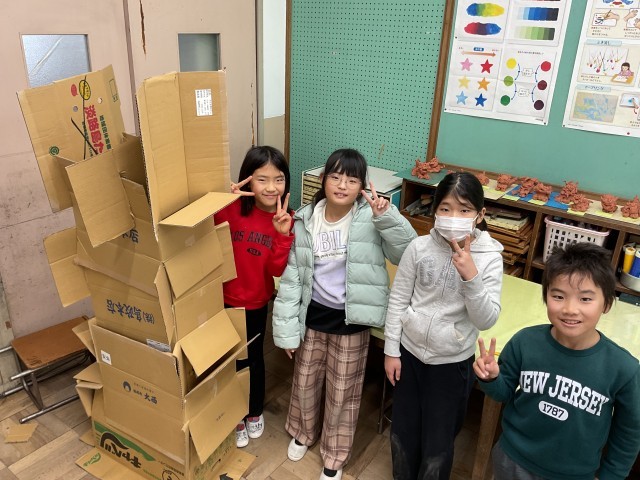 図画工作科「クミクミックス」の学習では、段ボールに切れ込みを入れ、自分たちの思いにあわせて、組み合わせました。