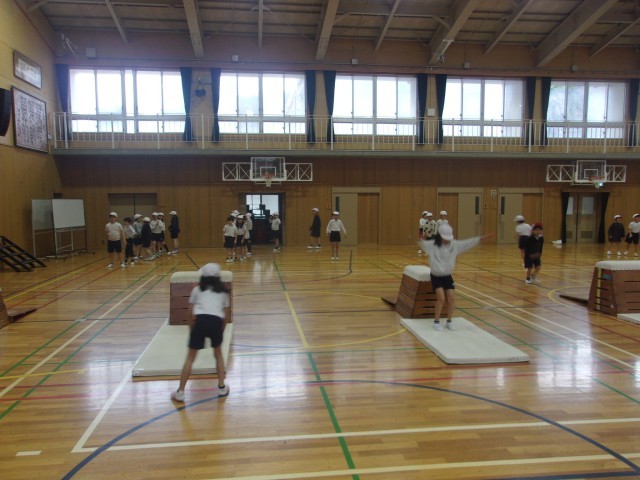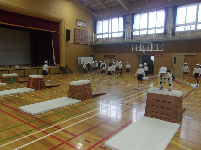 体育科「とび箱運動」の学習では、二年生までの学習を思い出し、自分のできるとび方で、色々な高さに挑戦しました。