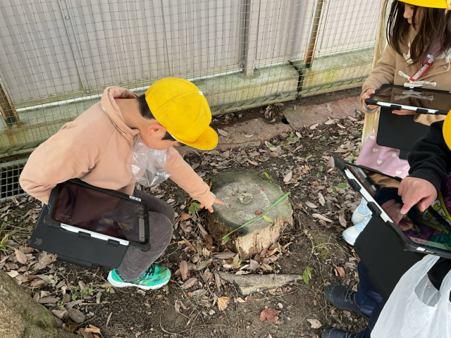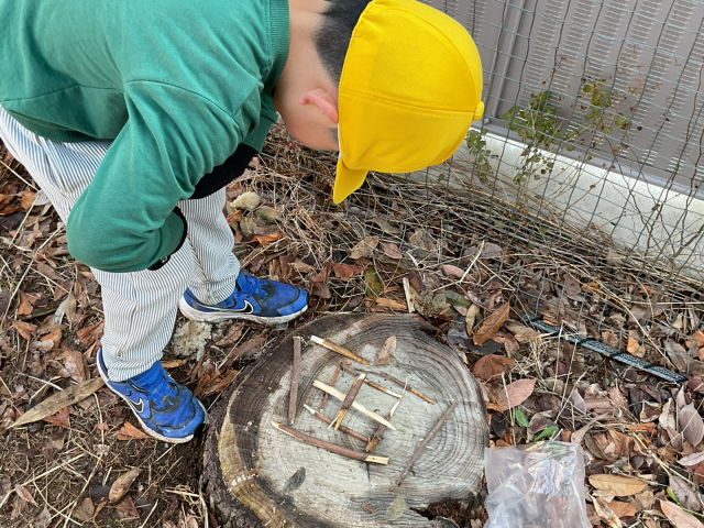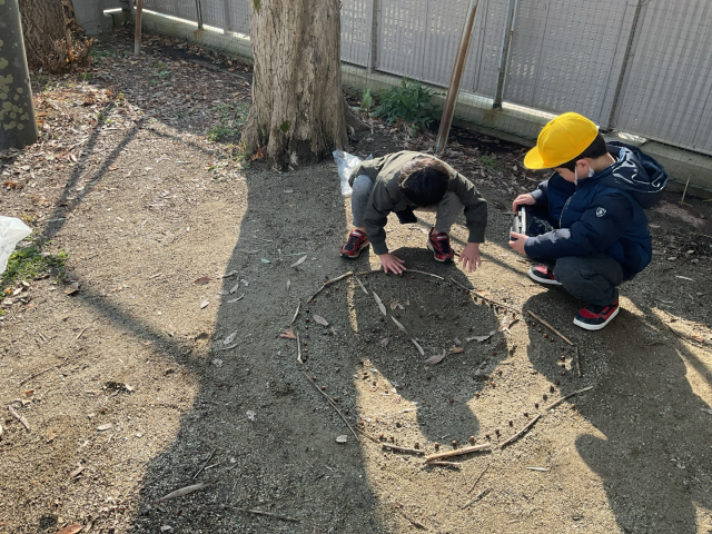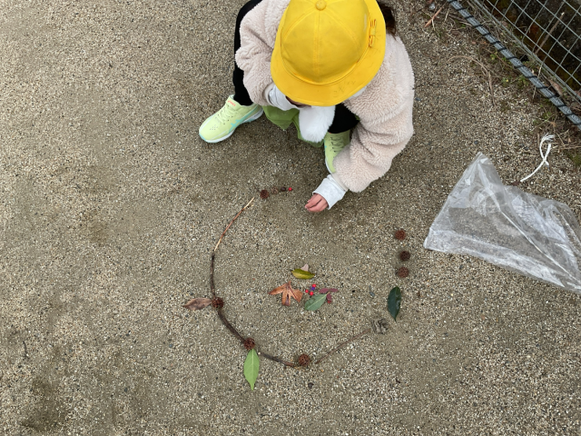 子ども達は、葉っぱや石、木の枝を見つけて自由に並べていました。