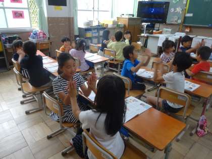 今日の音楽は,「みんなであそぼう」という歌に合わせて友だちと手拍子をしました。