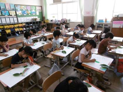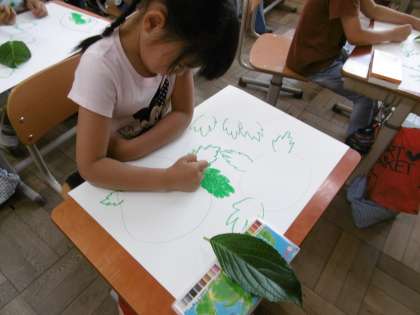 その後,葉っぱを見て,葉っぱの特徴をとらえながらパスで描いていきました。