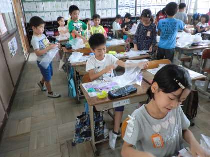 袋で作品を作り,送風機を使ってふわふわと飛ばすことを楽しむ学習です。
