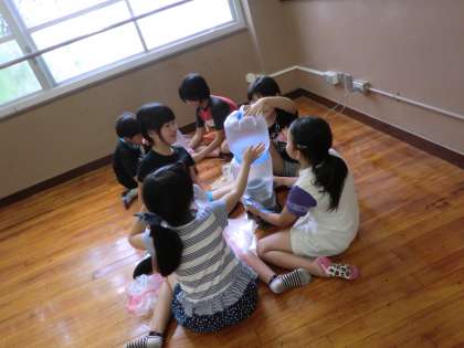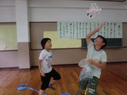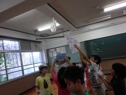 作品が完成したら,送風機を使って飛ばします。