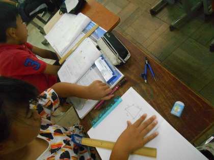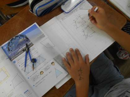 定規やコンパス,分度器などを使って,合同な四角形をかきました。