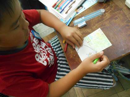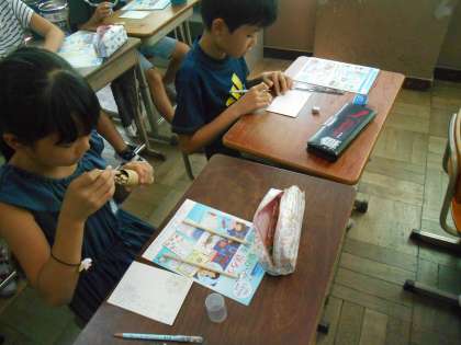 思い思いに絵をそえながら,暑中見舞いを書きました。