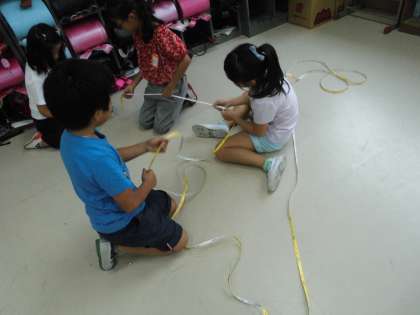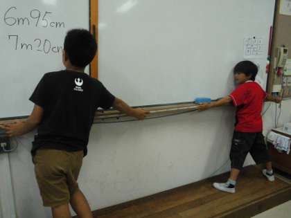 算数科の学習で,巻尺を使ってものを測る方法を考えました。