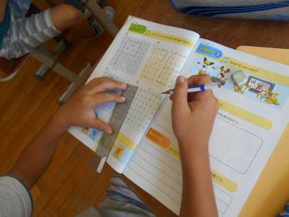 アルファベットの大文字とその読み方をふり返り,Alphabet Chantを言ったり,聞き取った英語を使って点つなぎをしたりしました。