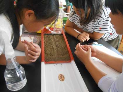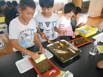 モデル実験の装置を操作して,流れる水の速さや量の変化を調べる実験をしました。