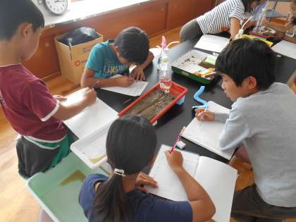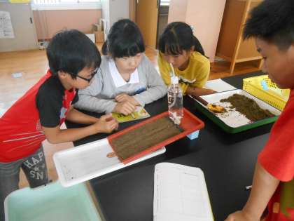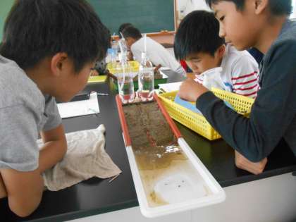 モデル装置を見ながら,流れが速いところ,曲がって流れているところ,流れがゆるやかなところのそれぞれの地面の様子について考えました。