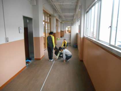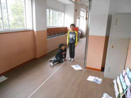 メジャーをのばし,お友だちと協力して10歩の平均から歩幅を求めることができました。