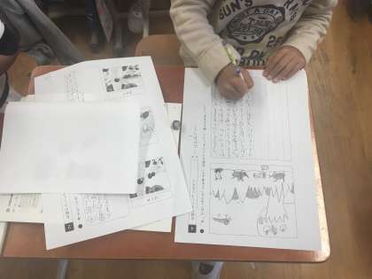 教科書に,はじめとおわりの絵が描かれており,その絵をもとにお話を作っていきます。