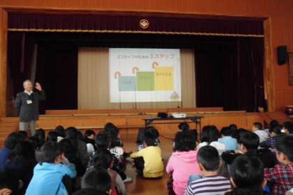 9日に気候ネットワークの方々に来ていただき地球温暖化などについて学びました。今日から自分たちにできることはどういったことなのか、このまま地球温暖化が続くとどのようなことがおこるのかということをクイズも交えながら楽しく教えていただきました。エコライフのためのスリーステップ「へらす・えらぶ・きりかえる」を合言葉にできることから取り組んでいきたいと思います。