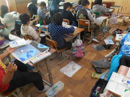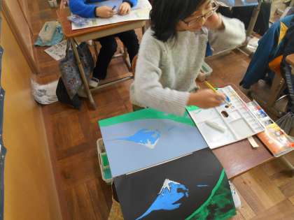 真剣な表情で,色の重なり方を何度も確認しながら進めることができています。