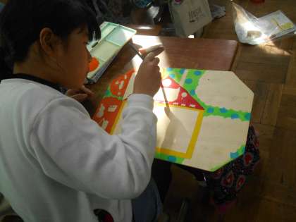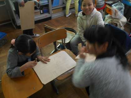 お友だちと手を取合い,わきあいあいと作業を進めています。