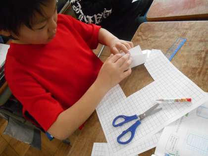 角柱や円柱の見取り図や,角柱の展開図をかきました。