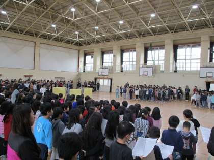 全校合唱では,音楽委員の5年生が歌詞カードを見せながらみんなをリードしてくれました。