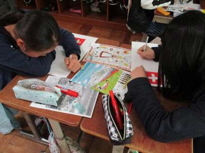 国旗や名所,名物について,イラストを添えてかいています。