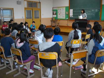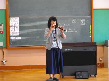 さっそくM先生から特技(ソプラノ・アルトリコーダーを1度に演奏する)を披露していただくと,子ども達はびっくり・・・!