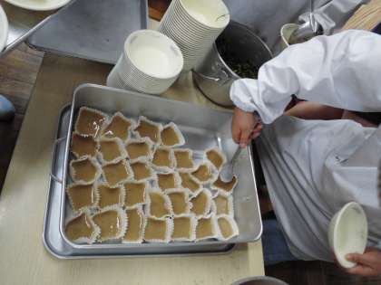 今日は,スチームコンベクションオーブンを使って作った「ういろう(黒ざとう)」が登場しました!給食室で手作りしたういろうを,初めての1年生もおいしく食べていました。