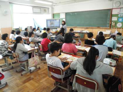 CDから流れてきた英文を聞き取って、メモをしたり、自己紹介に必要な単語を書いて自己紹介をしました。子どもたちは真剣に英文を聞いて、学習をしていました。