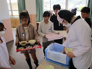 トレーに給食をとって,新鮮な気持ちで給食の時間を楽しんでいました。