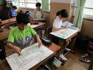 いろいろな場所から見た風景を切り取って表していますが,同じ場所でも見る人や見方が変わると大きな違いが見られることに気付いている子もいました。