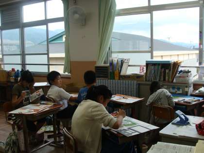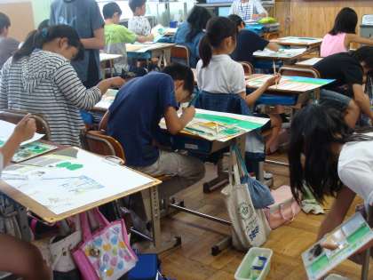 図画工作科の学習では,様々な場所から見た学校の景色を立体的に描いています。遠近法などを使って,それぞれの学校の好きな場所を絵に表しています。