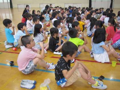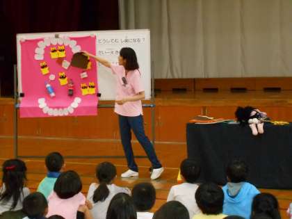 6月20日(水)5時間目に歯科衛生士の矢田直美先生に歯の磨き方を教えていただきました。お友達の人形モンちゃんが登場し、お菓子をいっぱい食べて、ねてしまいましたが、歯みがきをしたおかげで虫歯にならずにすみました。1年生も矢田先生と一緒にはみがきをがんばりました。