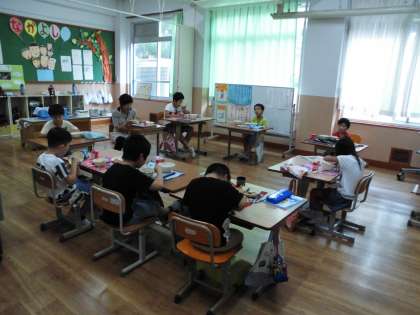 たいよう学級の給食時間の様子です。みんなで向かい合って,楽しいお話をしながらいただきます。教室に入ると「おいしい!」という声が聞こえてきました。苦手な食べ物が出る日もありますが,みんな頑張って食べています。