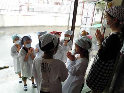1年生の給食時間の様子です。給食当番のお仕事にも慣れ,上手に準備をすることができています。給食を取りに行くときの「いただきます」の挨拶もとても気持ちがいいですね!最後の写真は,大盛り上がりの牛乳じゃんけんの様子です。勝った子は,とても嬉しそうに牛乳を飲んでいました♪