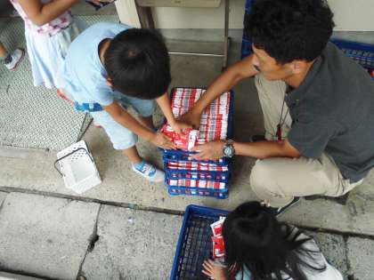 給食室のサービスホールの入口では,牛乳パックを回収しています。