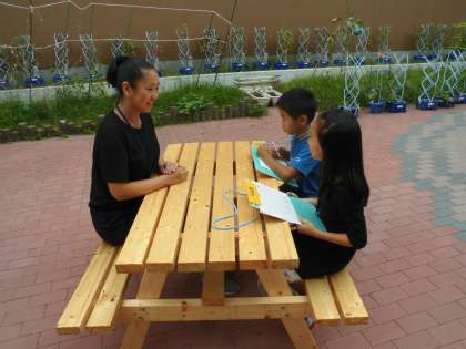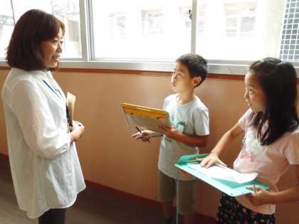 とアポイントをとって,インタビューに来たところです。1年生にわかりやすく伝えたいという気持ちで,一生懸命聞き,メモしています。