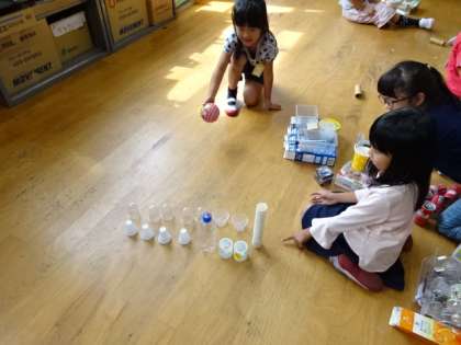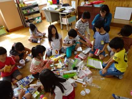 2年生は身近にあるいらなくなったものを組み合わせ,いろんな遊びを考えて遊んでいます。