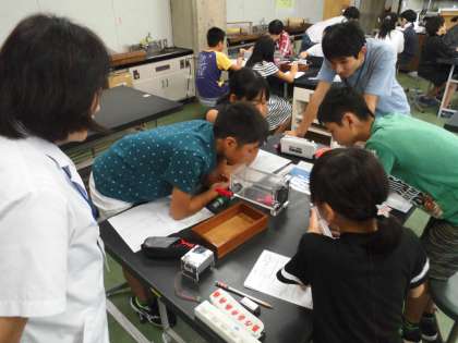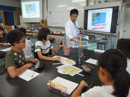 科学センターの先生からの問いかけに,まずは,うちわで風を作り,風速計で計測を体験。次に,2つの天気図を見比べて考えたり,シリンジという道具を使ってケースの中の気圧を変えて実験したりしました。