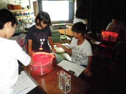 お灸のけむりにレーザー光線を当てて,空気の動きを観察しました。