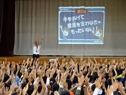 校長先生からは1年間の真ん中にさしかかったという話がありました。そして,ここからがんばれば一気に伸びていくよというお話をしていただきました。そのためのキーワードは,「手をあげて 意見を言わなきゃ もったいない!」です。どのクラスもたくさん意見を出し合い,学び合うクラス集団になっていけばいいなと思います。