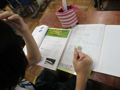 子どもたちのノートをのぞいてみると,先生の板書を書くだけでなく,自分で工夫して配置を考えたり,色をつけたりと分かりやすいノートができていて感心しました。