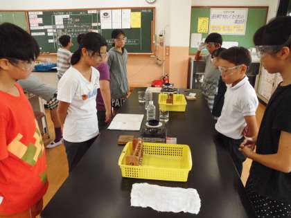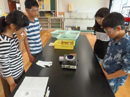 蒸発させたり,温めてにおいを確かめたり,石灰水を入れて反応を調べたりしました。