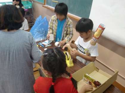 身辺材料を使ってどんな遊びができるのか,グループで試しながら考えました。