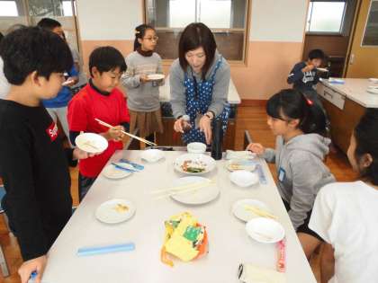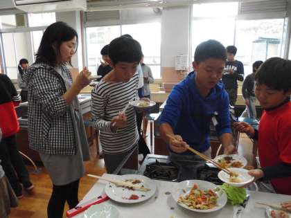 試食タイムも食べる人のことを考えながら真剣!後半はビュッフェスタイルで,他の班のおかずも試食しました。