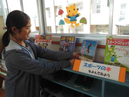 学校図書館を訪ねると,図書委員の6年生が『スポーツの本』のコーナーを整理していました。『読書の秋』に図書館で『スポーツの秋』も楽しめるようです。