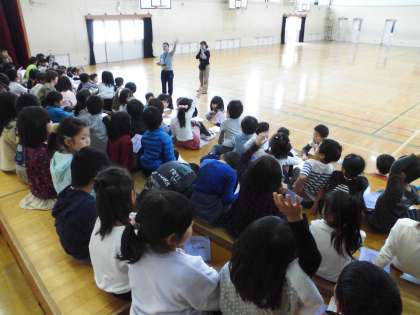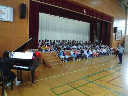3クラスそろって体育館で練習しました。ピアノ伴奏に合わせて歌ったり,並び方や移動の仕方を覚えたりしました。広い体育館に響き渡るよう,一生懸命,歌っています。
