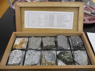 火山活動で土地がどのように変化するか考える中で,玄武岩や溶岩,花崗岩などの火成岩の標本を見せていただきました。