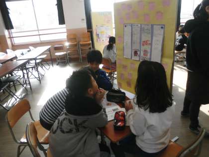総合的な学習の時間では,「山科循環バス」について調べています。循環バスに一人でも多くの人に乗車してもらうために,取り組んでいます。今回は,山科循環バスについて調べ,まとめたことをグループごとに見たり,読んだりしました。そして,さらに工夫できるところはないか考え,アドバイスを付箋に書きました。