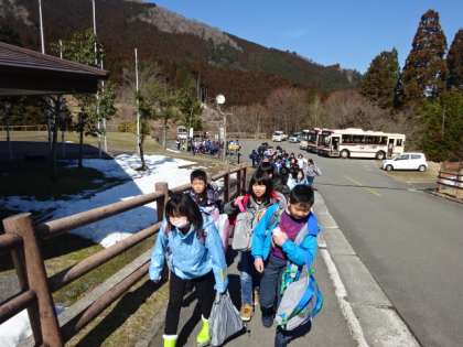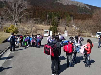 山の家に着きました。気温は12度。予想以上に暖かいですが,雪は施設のいたるところに残っていました。雪を使った活動が少しでもできるといいな〜。