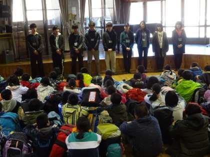 到着後入所式を行いました。所員さんからは,「京都市165校中,今年度最後の長期宿泊の学校なので,来年度につながる立派な宿泊学習にしてください。」というお話をいただきました。また,入所式後には4日間お世話になる,学生ボランティアの先生の紹介を行いました。司会の子どもの話にもありましたが,みんなの力で素敵な宿泊学習にしていきたいと思います。