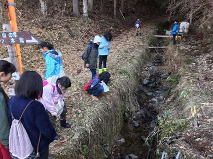午前中,まずはネイチャービンゴゲームに挑戦しました。動物の足跡,鳥の声,動物のフン,鳥の羽,倒れた植物…など,所内を五感を最大限に使って自然に注目して歩きました。都会では敬遠されがちな動物のフンを自然の中から見つけて大興奮の子どもたち。自然に目を向けることの大切さに気付かされたゲームでした。