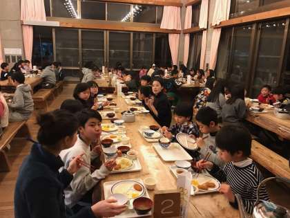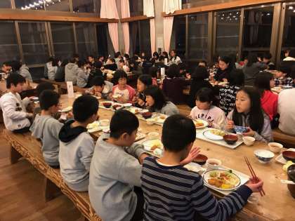 2日目の夕食も豪華です。栄養バランスを考えながら,おなかいっぱいいただきました。よく寝て,よく食べて,よく動き,規則正しく生活をしているので,みんな元気そうです。