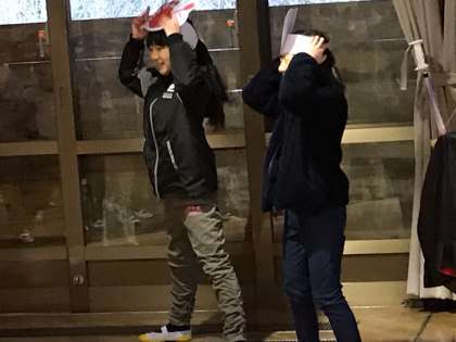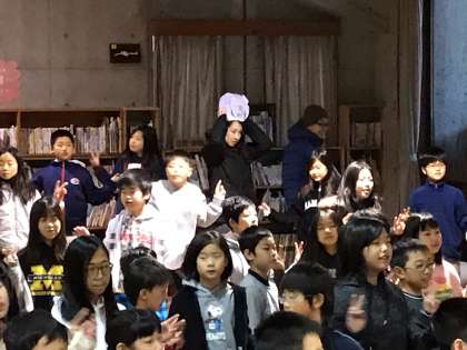 朝の集いはエビカニクスからスタートです。お面をつけて係の子がキレッキレの踊りでみんなを引っ張ってくれました。よく見てみると,奥には先生もお面をつけてエビカニに変身。みんなで楽しく踊りました!
