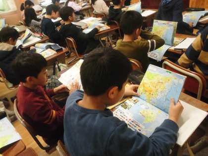 社会科「京都府と各地のつながり」の学習では,じゃがいもの行方をスライドや地図帳で追いかけていきました。身近に食べているじゃがいもは,いろいろなルートを通って私たちの元に届けられていることに気付くことができました。